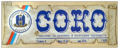 Из штампе је изашао први ванредни број часописа „Соко“, Српског соколског друштва „Соко“ из Добруна, посвећен стогодишњици Првог свјетског рата. 18. 06. 2014. У недјељу Свих Светих, 15. јуна, прослављена је слава храма у Обртићима-Стјеницама код Сокоца. 05. 06. 2014. Његово преосвештенство епископ славонски господин Јован служио је у Недјељу Светих Отаца Првог васељенског сабора, 1. јуна, Свету архијерејску литургију у храму Светог Саве у Фочи. 04. 06. 2014.