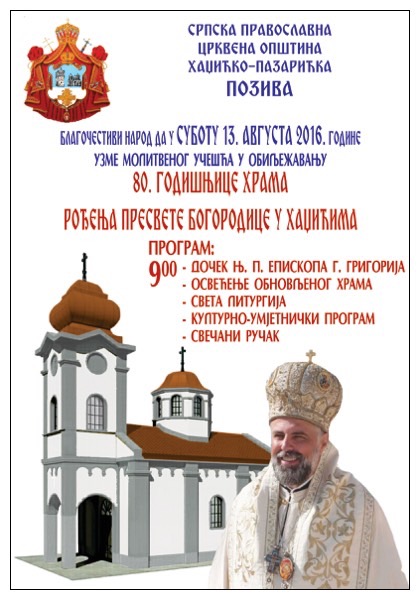 21.08.2016 ПРАЗНИК ПРЕОБРАЖЕЊА ГОСПОДЊЕГ ПРОСЛАВЉЕН У ЧАЈНИЧУ Празник Преображења Господњег, свечано је прослављен у цркви Успења Пресвете Богородице у Чајничу. 21.08.2016 СВЕТА АНГЕЛИНА СРПСКА ПРОСЛАВЉЕНА У ИСТОЧНОМ НОВОМ САРАЈЕВУ У насељу Топлик-Тилава, Источно Ново Сарајево, 12. 08. 2016. г. свечано је прослављена слава храма у изградњи, који је посвећен Светој Ангелини српској. Светим Сабрањем началствовао је протојереј ставрофор Војислав Чаркић, уз саслужење свештенства више епархија Српске Православне Цркве и великог броја вјерника. 13.08.2016 ОСВЕЋЕН ОБНОВЉЕНИ ХРАМ РОЂЕЊА ПРЕСВЕТЕ БОГОРОДИЦЕ У ХАЏИЋИМА У суботу 13. августа 2016. године, Епископ захумско-херцеговачки и приморски и Администратор Митрополије дабробосанске господин Григоријe је извршио освећење обновљеног храма Рођења Пресвете Богородице у Хаџићима и служио је Свету Архијерејску Литургију уз саслужење и присуство свештенства и монаштва из више Епархија Српске Православне Цркве. 09.08.2016 ПРОСЛАВЉЕНA КРСНА СЛАВА ЦРКВЕ БРВНАРЕ НА БЈЕЛОМ БРДУ У понедељак 08. августа 2016. године, црква брнара која се налази на бјелобрдској парохији прославила је своју крсну славу, Свету преподобномученицу Параскеву. 07.08.2016 ЈУБИЛЕЈ 80 ГОДИНА ХРАМА РОЂЕЊА ПРЕСВЕТЕ БОГОРОДИЦЕ У ХАЏИЋИМА СРПСКА ПРАВОСЛАВНА ЦРКВЕНА ОПШТИНА