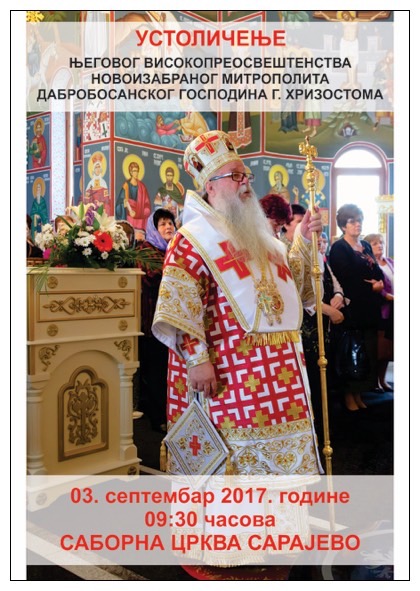 Велики празник Ваведења Пресвете Богорoдице, крсну славу Царске лавре на Светој Гори Атонској Хиландару, игуман манастира архимандрит Методије и његово братство прославили су и ове године благости Господње на начин који приличи овој нашој Царској лаври. Међу многобројним гостима који су приспјели за славу манастира Хиландара био је и Високопреосвећени Митрополит дабро-босански Господин Хризостом, као изасланик Његове Светости патријарха српког г.г. Иринеја и Светог арх. синода, који је и началствовао свим овогодишњим празничним богослужењима. 30.11.2017. У МИТРОПОЛИЈИ ДАБРО-БОСАНСКОЈ САВЈЕТОВАЊЕ ПОВОДОМ ДЕШАВАЊА СА И ОКО ГРОБАЉА У И ОКО САРАЈЕВА Поводом све учесталијих напада на српска православна гробља у и око Сарајева, те медијских натписа о намјери КАНТОНАЛНЕ ВЛАСТИ да изврши ''чишћење и ликвидацију'' око 13 000 гробних мјеста - углавном српских, као и појаве наљепница по гробницама и споменицима, данас је, 30. новембра 2017. године, у згради митрополије у Сарајеву, на приједлог и иницијативу Високопреосвећеног митрополита дабро-босанског г.г. Хризостома, уприличено савјетовање по овим горућим питањима. 29.11.2017. МИТРОПОЛИТ ХРИЗОСТОМ ПО ДРУГИ ПУТ ПОСЈЕТИО МАНАСТИР ПРЕОБРАЖЕЊА ГОСПОДЊЕГ У ГРАЂЕНИКУ