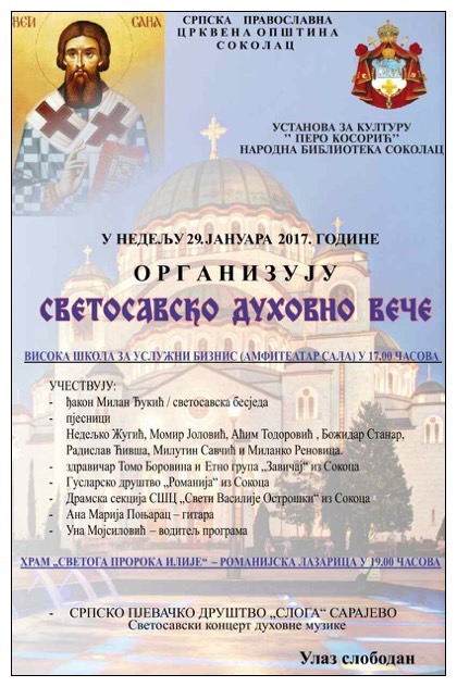 03.07.2017 ВИДОВДАНСКЕ СВЕЧАНОСТИ У СОКОЦУ Видовданске свечаности које се традиционално одржавају у Сокоцу, почеле су пригодним програмом 27. 06. 2017. године у амфитеатру Високе школе за услужни бизнис у Сокоцу. 22.06.2017 КОНЦЕРТИ ХОРА СМЈЕРА ЗА ЦРКВЕНУ МУЗИКУ И ПОЈАЊЕ МУЗИЧКЕ АКАДЕМИЈЕ УНИВЕРЗИТЕТА У ИСТОЧНОМ САРАЈЕВУ У СРЕМСКИМ КАРЛОВЦИМА И У БЕОГРАДУ Хор Смјера за црквену музику и појање Музичке Академије Универзитета у Источном Сарајеву, под умјетничким руководством маестра Рада Радовића, одржао је два цјеловечерња концерта: у Сремским Карловцима (Свечана сала Карловачке гимназије), 16. јуна и у Саборној цркви у Београду, 17. јуна. 03.06.2017 СПД ,,СЛОГА" ПОСТАЛА ЧЛАН НОВОФОРМИРАНОГ СРПСКОГ ХОРСКОГ САВЕЗА! На дводневној манифестацији у Сомбору, представник Слоге диригент Стефан Мојсиловић присуствовао је оснивачкој скупштини Српског хорског савеза. Уз директно учешће око 50 диригената и хорских радника и око 120 раније пријављених хорова, Савез је свечано формиран у навечерје Недеље Светих отаца Првог Васељенског сабора 27. маја 2017.г. 26.05.2017 ЖИВОТОПИС ЊЕГОВОГ ВИСОКОПРЕОСВЕШТЕНСТВА НОВОИЗАБРАНОГ МИТРОПОЛИТА ДАБРОБОСАНСКОГ ХРИЗОСТОМА