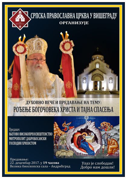 Поводом радосних празника којима се приближавамо, Његово високопреосвештенство Митрополит дабробосански Г. Хризостом ће у петак 22. децембра 2017. г. у 19 часова у Великој биоскопској сали у Андрићграду у организацији СПЦ Вишеград, одржати предавање на тему: „Рођење Богочовека Христа и тајна спасења“. 18.12.2017. ОТВОРЕНЕ ПРИЈАВЕ ЗА ШKОЛУ ЦРКВЕНЕ МУЗИКЕ ПРИ ПРАВОСЛАВНОМ ЦЕНТРУ ЗА МЛАДЕ МИТРОПОЛИЈЕ ДАБРОБОСАНСКЕ