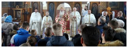 19.02.2018. МИТРОПОЛИТ ХРИЗОСТОМ СЛУЖИО У МОКРОМ У сиропусну недјељу, 18. фебруара 2018. године и на дан успомене св. муч. Агатије, Његово Високопреосвештенство г.г. Хризостом, Митрополит дабро-босански посјетио је село Мокро у Општини Пале и служио свету архијерејску литургију у парохијском храму Успенија Пресвете Богородице. Са Високопреосвећеним господином Митрополитом саслуживали су: протојереј-ставрофор Милојко Дробљањак, протојереј- ставрофор Илија Чупић, јереј Далибор Стакић, јереј Младен Дробњак и ђакон Будимир Гардовић. На великом входу Високопреосвећени господин Митрополит одликовао је старјешину храма протонамјесника Драгана Матића чином протојереја. У бесједи на јеванђеску тему: пости и моли, Високопреосвећени је поучио вјерни народ о суштини и значају поста управо онако како је сам Господ Исус казао............ ''а ти када постиш не буди као фарисеј или зилот који направе лица своја тужним и суморни, који се посипају пепелом, само како би их људи видјели да посте. Не, браћо и сестре, не чинимо тако јавним наш пост и нашу молитву, већ кад постимо сакријмо се у клијет срца свога и тамо у својој скровитости молимо се Богу, постимо и разговарајмо са Богом својим који јесте Ријеч, који нас и чује и разумије! ................. Пост је и праштање, односно праштање и пост се прате. Чусмо малоприје како Господ рече - ако опростите гријехе једни другима и Отац ваш Који је на небесима опростиће и вама гријехе ваше! Ако не опростите гријехе једни другима ни Отац ваш небески неће опростите вама гријехе ваше. Браћо и сестре, гле у свакодневном нашем мољењу ми у Молитви Господњој (Оче наш, ) молимо да нам Бог опрости гријехе наше као што и ми опраштамо! Пазите, ми овом молитвом Господњом примамо благослов, али и проклетсво уколико не опраштамо гријехе једни другима. .............. Пост је уско повезан и са нашим опредијељењима - гдје је благо ваше тамо ће бити и срце ваше. Зато нас Господ на почетку овога поста увијек потсјећа на оно што је најважније, а то је да знамо да је само Бог наше највеће добро, а никако злато и сребо, новац и материјална добра која рђа нагриза и лопови поткрадају....................'' На крају бесједе Високопреосвећени је пожелио срећан, благословен и спасавајући пост свима и позвао све да се постом, молитвом, светом тајном исповјести припреме да буду достојни самог Господа и његовог свијетлог васкрсења. |