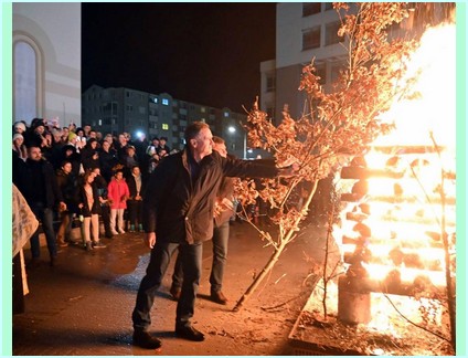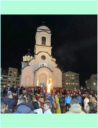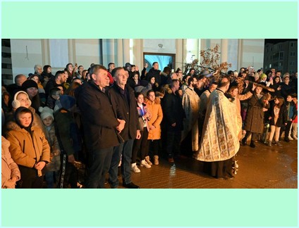У 17:00 часова звона овог велељепног храма још у изградњи означила су почетак празничног вечерња. Вечерњем богослужењу началствовао је протојереј Немања Манџић а уз саслужење протојереја Зорана Калајџића и јереја Дејана Бакмаза. Након вечерња у храму је обављено традиционално пијукање, а потом су, испред храма, изнесена и наложена три бадњака.