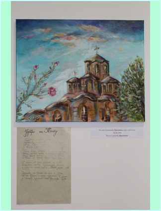 Поставку радова чине иконе које се повезују са пјесмама „Свети Сава“, „Пепео Светог Саве“, „Вјеруј и моли“, „Под распећем“, као и пејсажи, а инспирацију за ове радове полазници су нашли у пјесмама: „Јутро на Косову“, „Призрене стари“, „На Кајмакчалану“, „Бока“ „О класје моје“ и друге. Изложба је осмишљења тако да су поред сваког рада истакнуте краснописом и калиграфски исписане пјесме, тако да су посјетиоци могли да се подсјете најљепших родољубивих и лирских пјесама пјесника танане душе и јаких родољубивих осјећања.