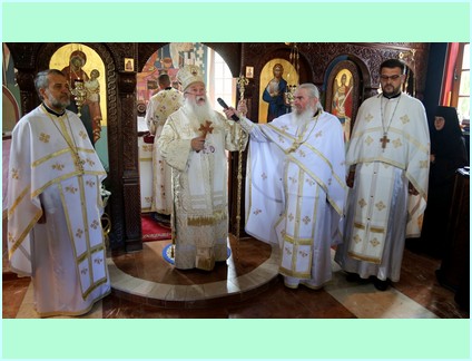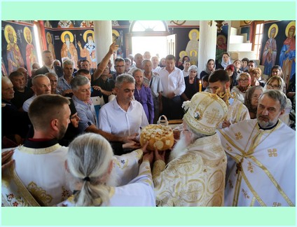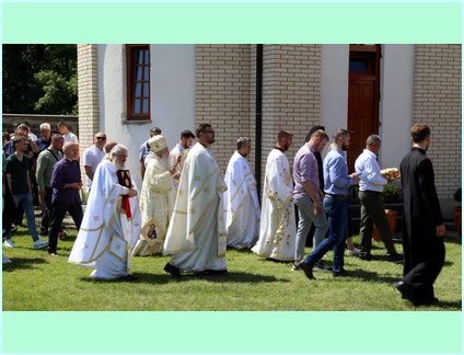 Након свете арх. литургије обављен је трократни опход око светог храма, благословљени славски дарови.