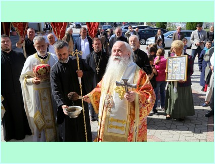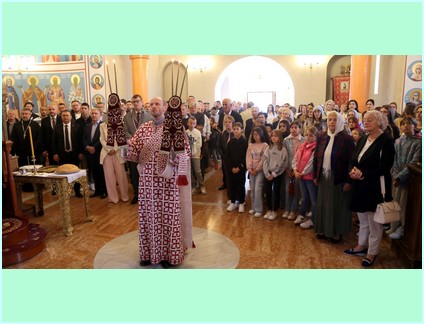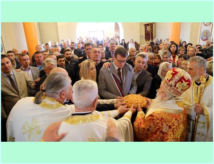 Након за-амвоне молитве Високопреосвећени је благословио славске дарове - кољиво и колач те исти преломио са кумом крсне славе храма Господином Маринком Божовићем, начелником општине Источна Илиџа. Након тога уследила је трократна литија око светог храма.