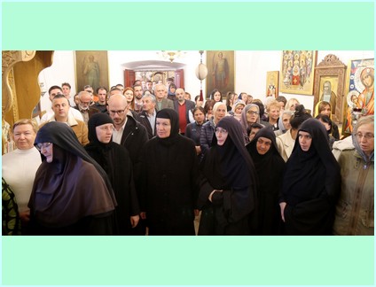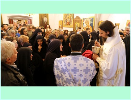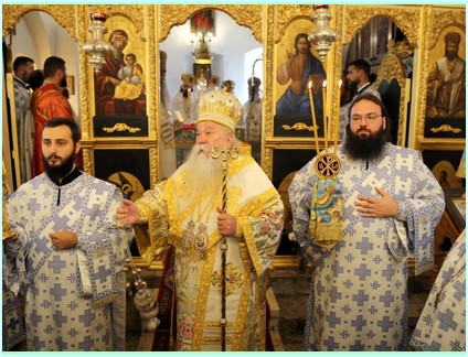 Високопреосвећеном Господину Хризостому саслуживали су Њихова Високопреосвештенства Господа митрополити: Иларион брегалнички; Јоаникије црногорско-приморски; Теодосије рашкопризренски и Димитрије захумско-херцеговачки, те Преосвећена Господа архијереји: славонски Јован, Марко делчевско-каменички, Јоаким дељадровско-илинденски и Пајсије дукљански. На крају свете архијерејске литургије благословљени су славски дарови - славско кољиво и славски колач.