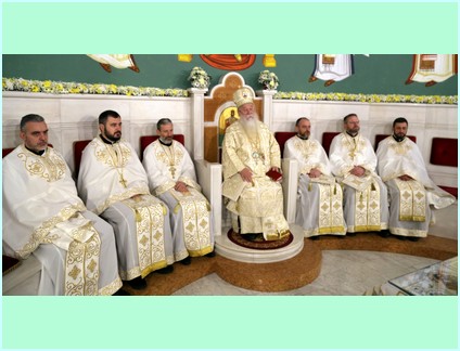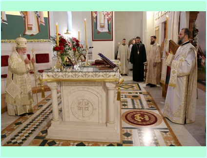 Свету архијерејску литургију служио је Високопреосвећени Господин Хризостом, архиепископ сарајевски и митрополит дабробосански, а уз саслужење Високопречасних протојереја-ставарофора: проф. др Владислава Топаловића, декана Богословског факултета ''Свети Василије Острошки'' у Фочи, проф. др Ненада Тупеше, проф. др Дарка Ђога, проф. Љубомира Пријовића, ректора богословије, јереја Стефана Андрића и проф. Синише Божића те ђакона Младена Старовића. Благољепију свете литургије увелико је доприњело пјевање Хора ''Побратимство'' из Фоче под диригентском палицом мр. Борислава Бјелогрлића.