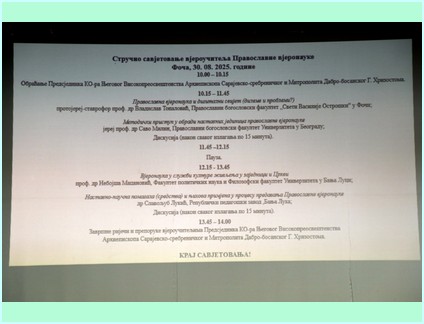 У суботу, 30. августа текуће 2025. године са почетком у 10:00 часова одржано је редовно годишње стручно савјетовање вјероучитеља православне вјеронауке за вјероучитеље из митрополије Дабро-босанске и епархије Захумско-херцеговачке. Савјетовање је одржано у амфитеатру Богословије ''Светог Петра Дабробосанског'' у Фочи. Претходно су одржана истовјетна предавања у Бијељини, Бања Луци и Мркоњић Граду.